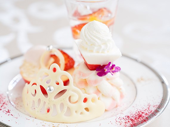 願いを叶える不思議な壺の中にいちごのパンナコッタと抹茶ソースを忍ばせました。さらに、プリンセスの大好物であるいちごケーキは上品な味わいに整え、花のようにカットされた新鮮ないちごやエディブルフラワーで飾りつけました。