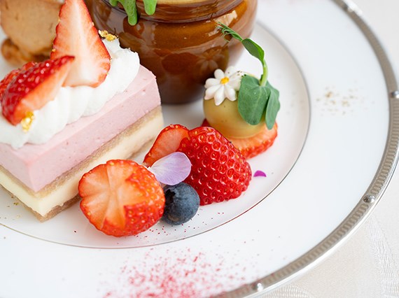 全体を通していちごのうまみをより一層引き立てる構成に。バルサミコと生ハムを組み合わせたいちごの甘み際立つオープンサンドに加え、サクサク食感のパニプリに包まれるスモークサーモンとポテトサラダ、軽やかな口当たりのグリーンピースのムースリーヌをコンソメジュレと合わせた3品をご用意。
