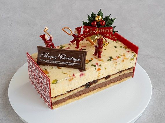 イチゴムースとホワイトチョコレートムースを重ね合わせたケーキ。雪のように白いメレンゲのデコレーションで聖夜を華やかに彩ります。