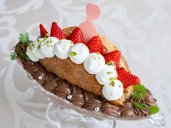 サクサク食感のパイで仕立てたふんわりスカートに、純白のクリームと真っ赤ないちごをトッピングして、乙女心をくすぐる、とびきりキュートな一皿の出来上がり。