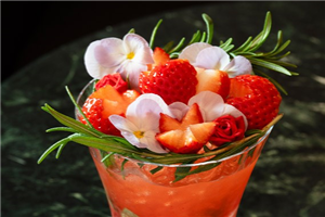 シュワッと弾けるシャンパンの艶めきに、いちごの甘い香りとミントの清涼感が重なり合う、洗練された大人のモヒート。グラスのトップには、ダイヤモンドカットやハート型に仕立てたいちごを散りばめ、宝石のような輝きを添えました。